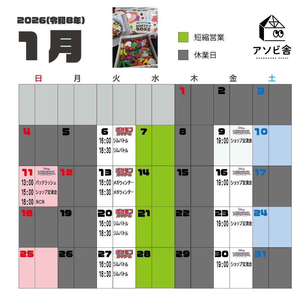 アソビ舎の来年1月の営業カレンダーを更新しました!