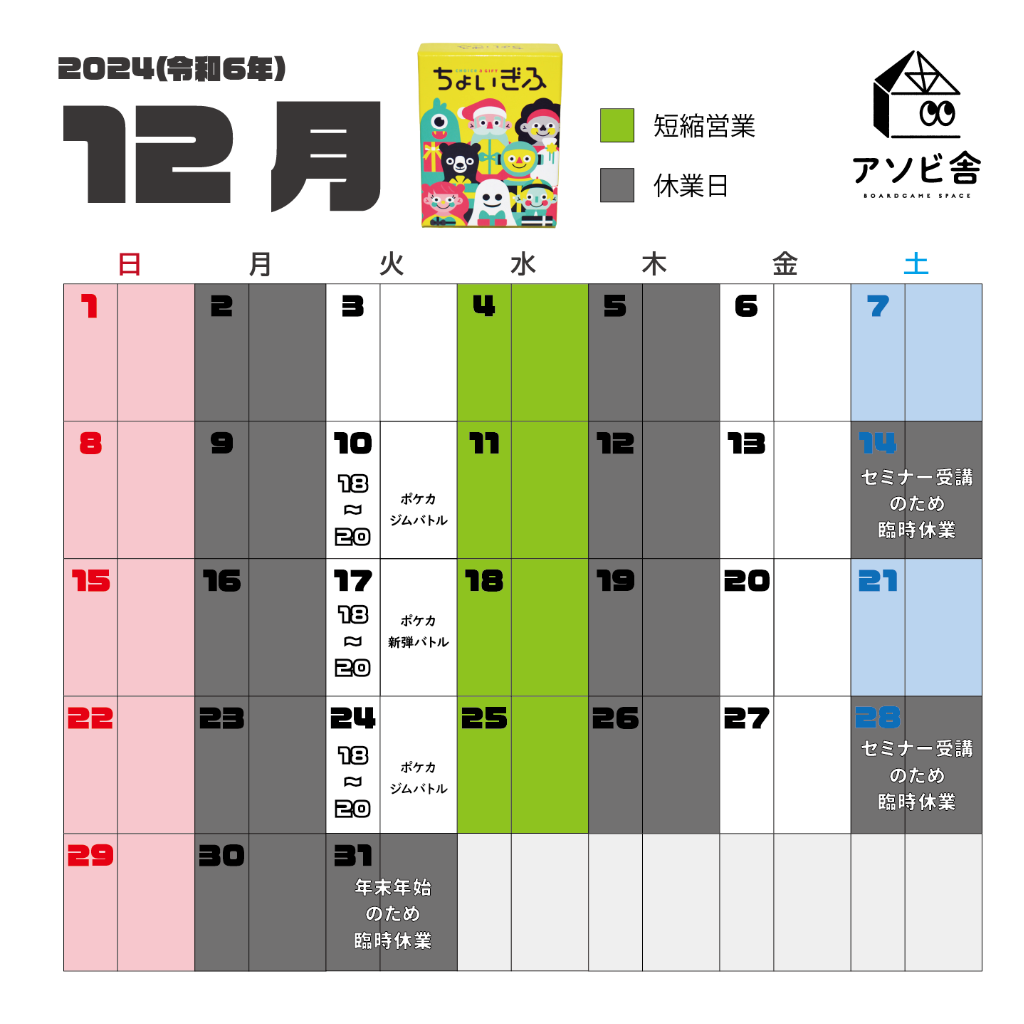 アソビ舎の年内最終営業は12/29(日)で、年始は4日(土)からの営業となります!
