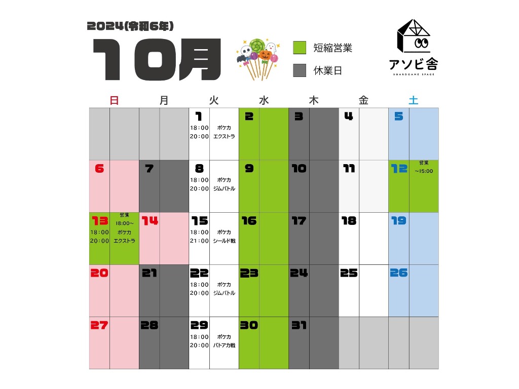 10月の営業カレンダーを公開させて頂きます。