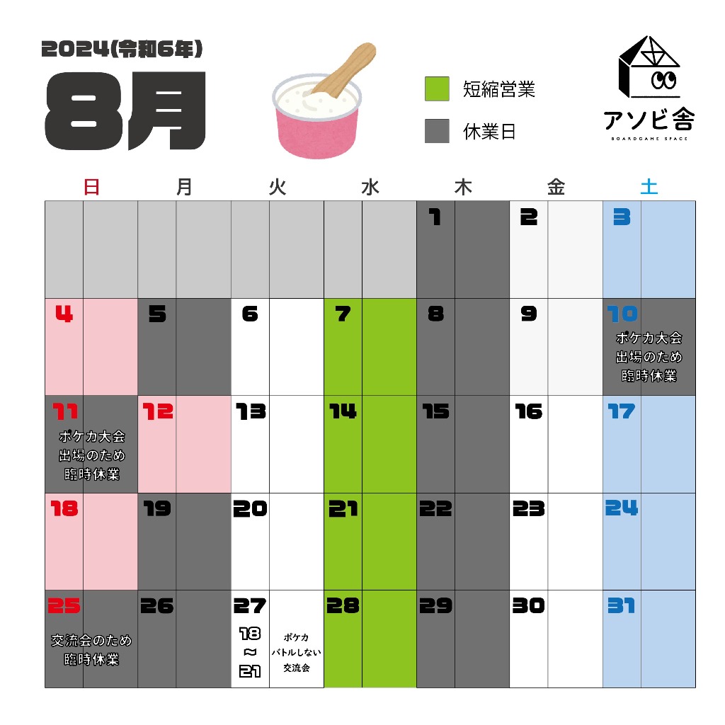 8月の営業カレンダーを作成しましたので、夏休み中もアソビ舎をよろしくお願いします!
