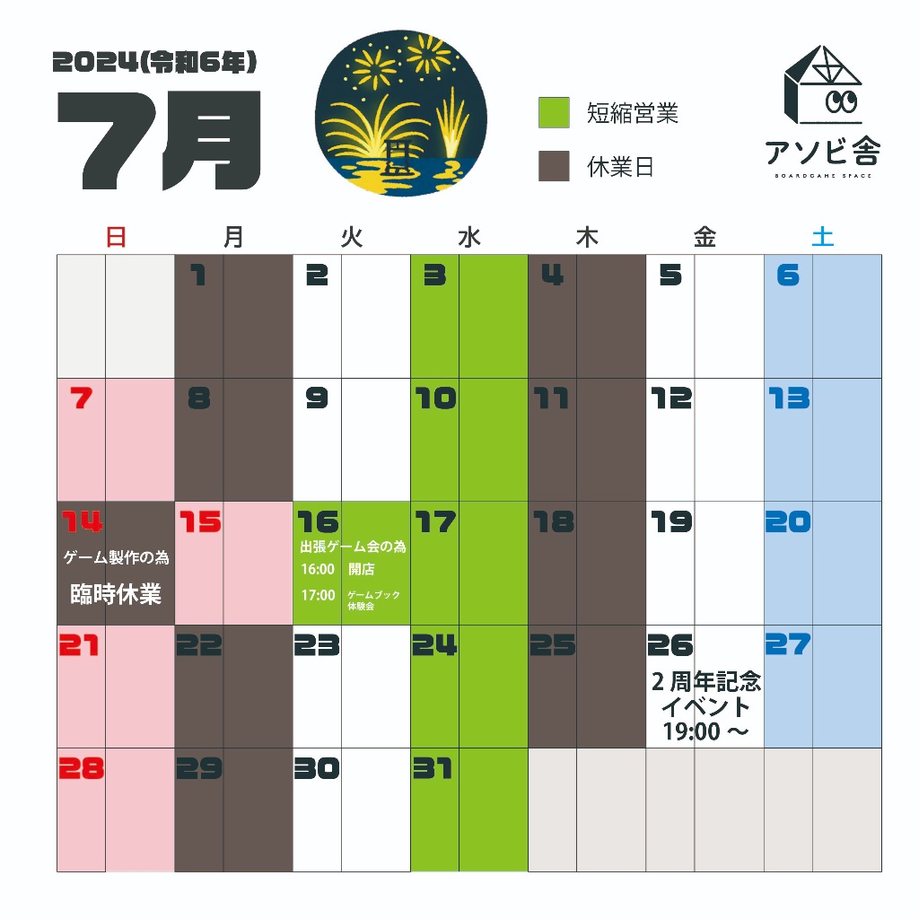 遅くなりましたが今月の営業カレンダーを公開します。
