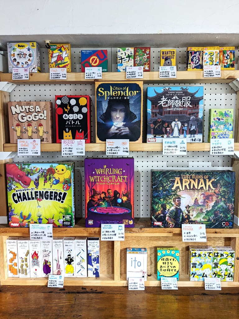 写真の棚に陳列している作品は、ボードゲーム初心者におすすめしやすい作品で、当店で遊んでその場で新品を買うことが出来る作品たちです~