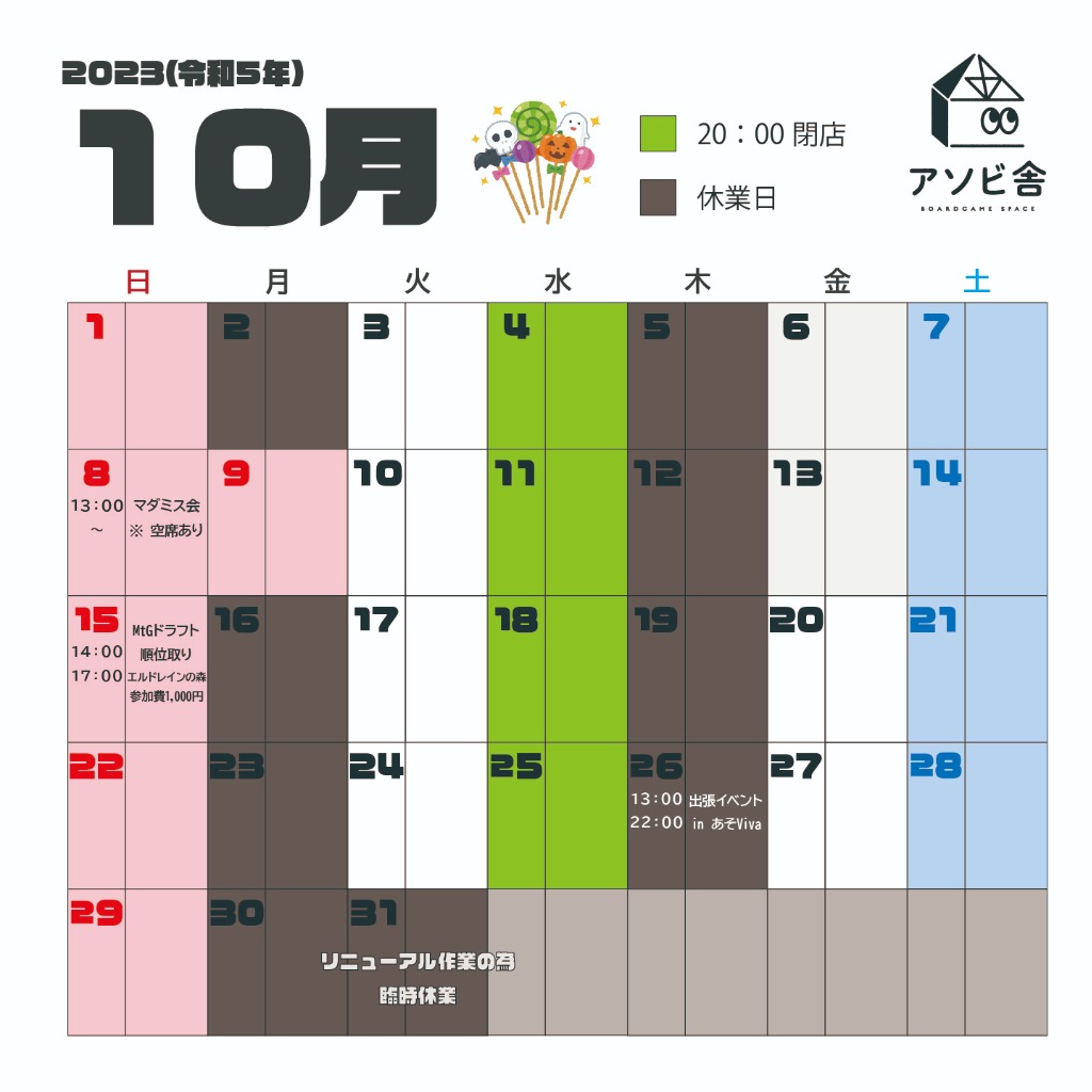 また、金曜日夜に隔週で開催していたMtGのイベントと、重ゲーのイベントはどちらも各回1名様程度という状況だったので、休止させて頂きます。
