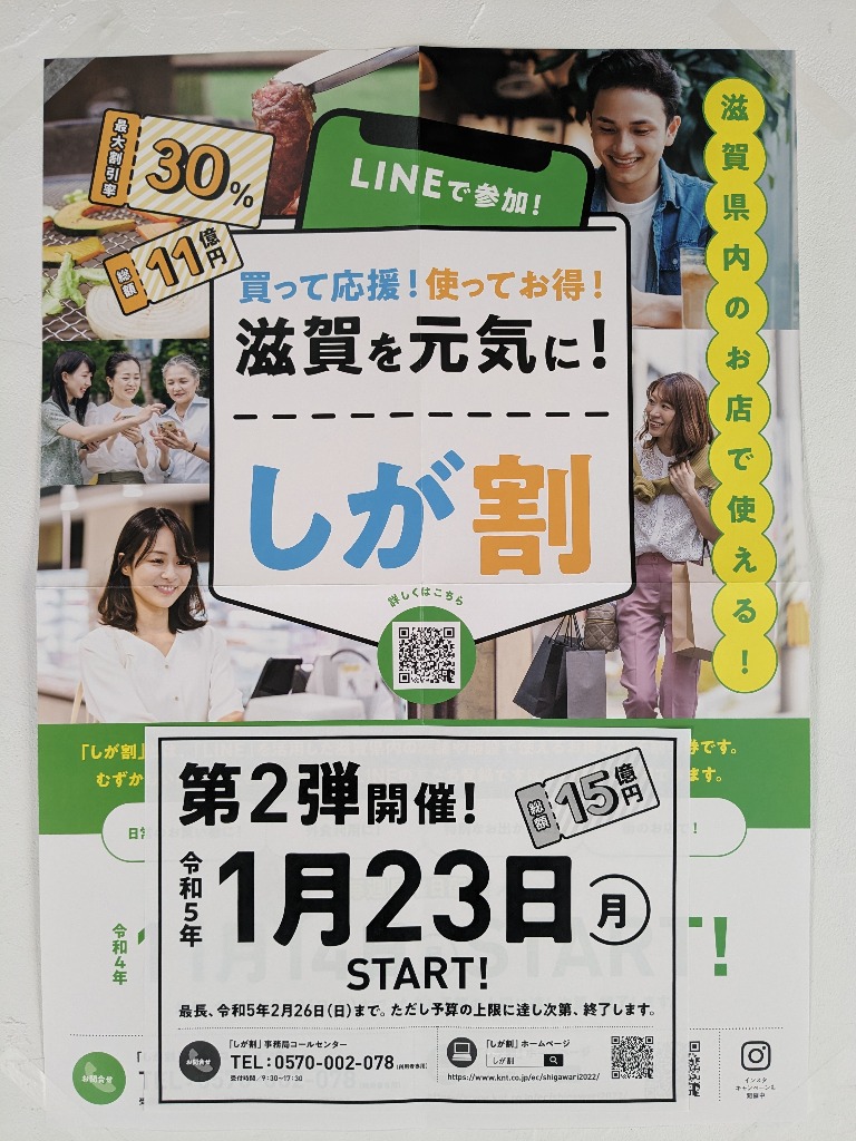 滋賀県内のお店で使えるしが割を、本日より当店でもご利用頂けるようになりました。